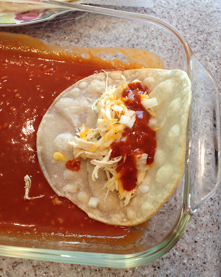 (I know how to make my own homemade red sauce but I started dinner too late and had to use canned red chili enchilada sauce instead. I have used Las Palmas or Macayo's brand. I think the canned sauce is too runny so I used a little chicken broth from the chicken I made earlier and added a little flour to thicken it.)